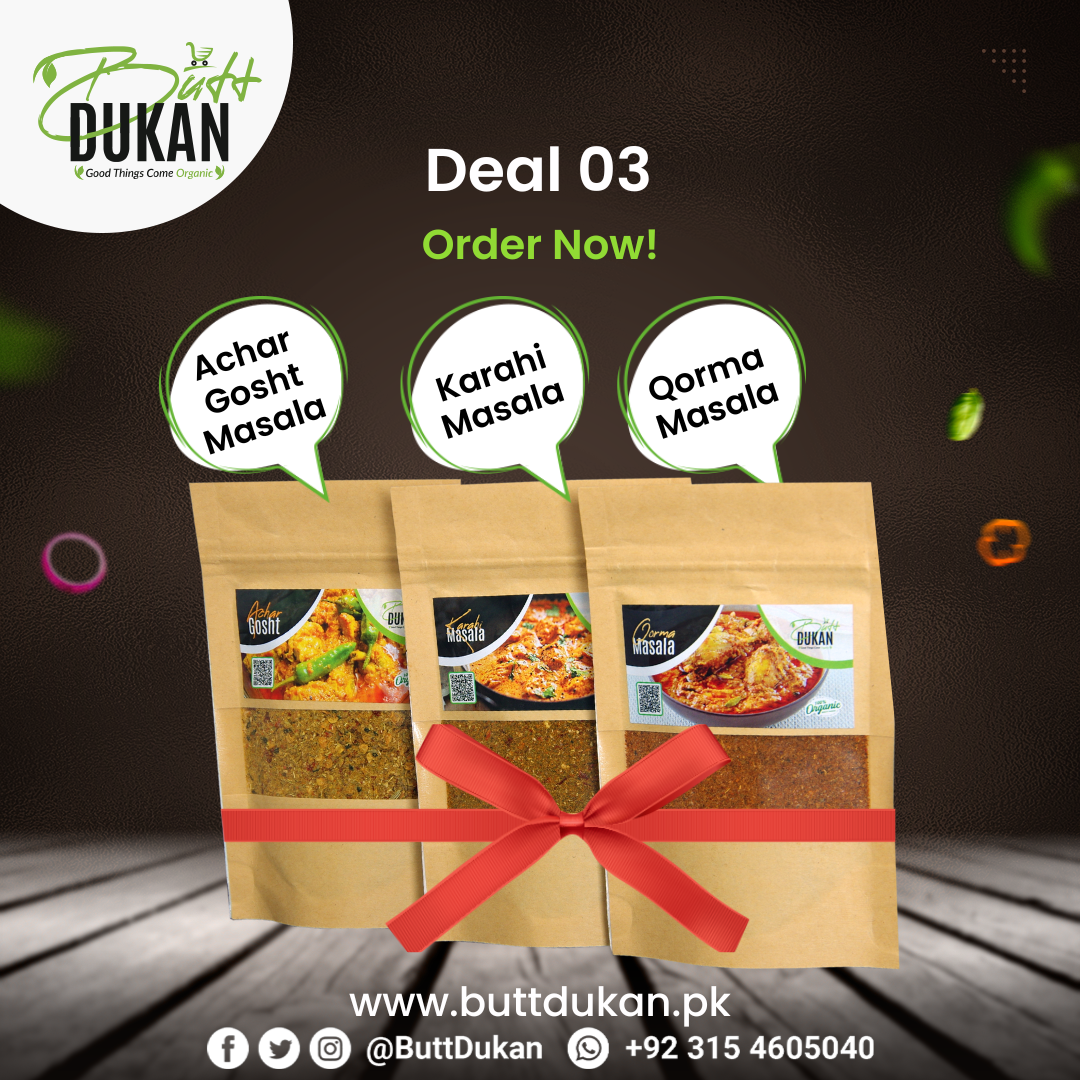 Butt Dukan Masala Deal 3 includes Achar Gosht, Karahi, and Qorma masalas. It presents a...
