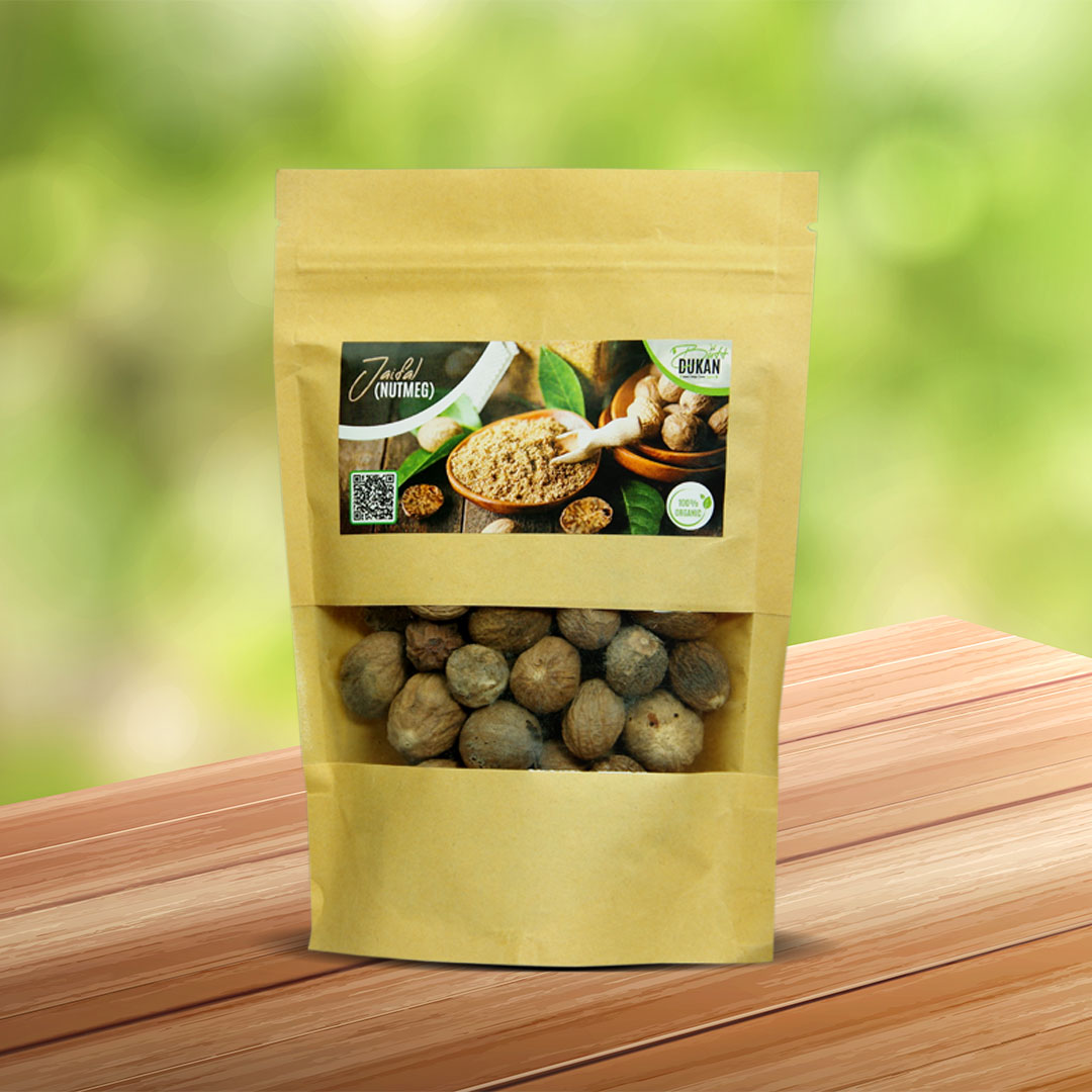 Butt Dukan's Jaifel (Nutmeg) is a highly valued spice derived from the seeds of Myristica fragrans which is found in the Spice Islands of Indonesia. It is cherished for its warm, nutty flavor, health benefits, and uses in culinary and medicinal contexts. Nutmeg is unique in that it offers two spices from the same fruit: nutmeg, the seed itself, and mace, the red lacy aril that encases the seed. Nutmeg's versatility in the kitchen is remarkable. It is used to flavor various dishes, including sweets like pies, custards, spice cakes, and savory dishes such as soups, sauces, and vegetable recipes.